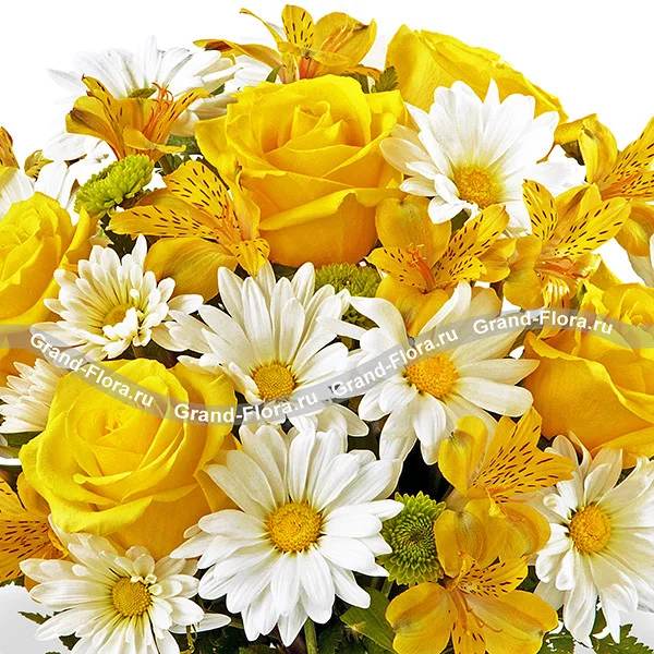 Яркая композиция, состоящая из белых кустовых и зеленых хризантем, желтых роз и альстромерий, наверняка поднимет настроение всем вокруг.