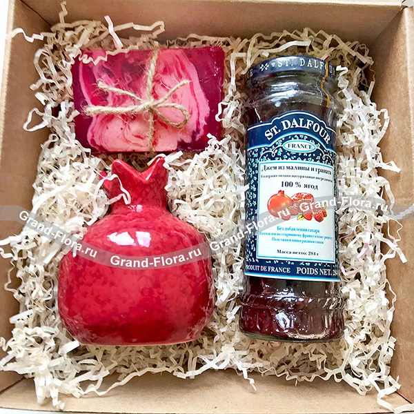 ваза в виде граната - 1 шт., варенье из граната  - 1шт., мыло с экстрактом граната - 1 шт., подарочная коробка, наполнитель.